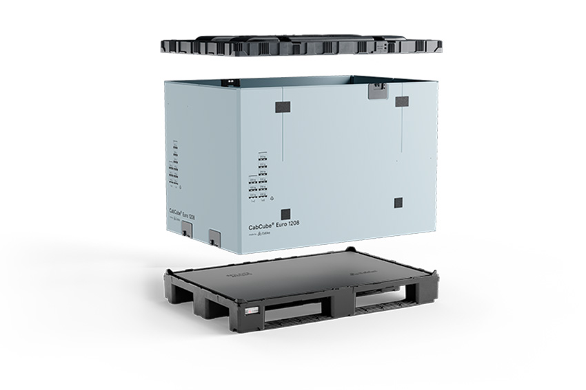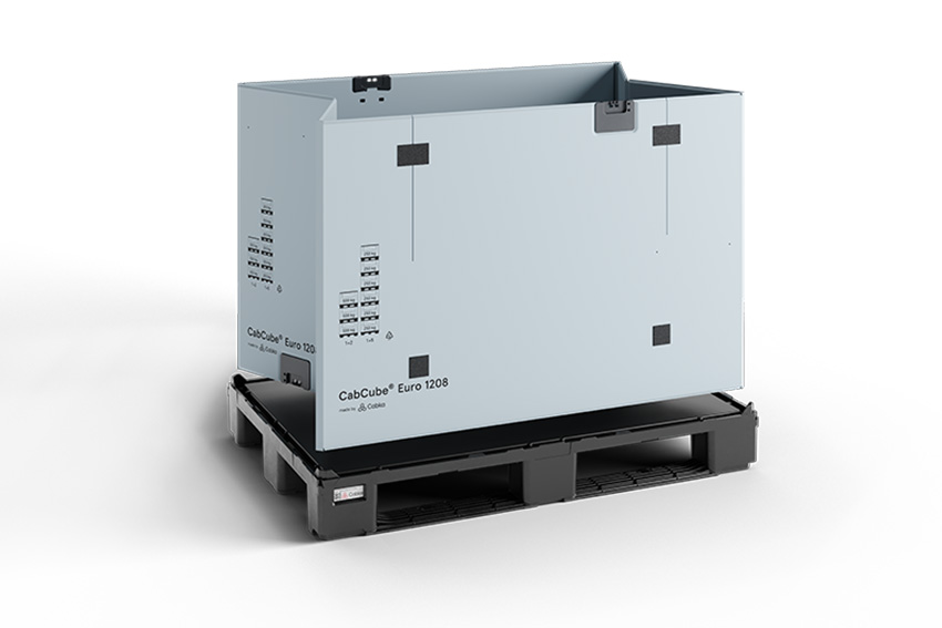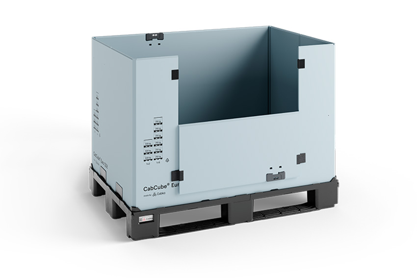 • Faltbarer Container mit M-fold Sleeve mit Deckel und Palette auf 3 Kufen