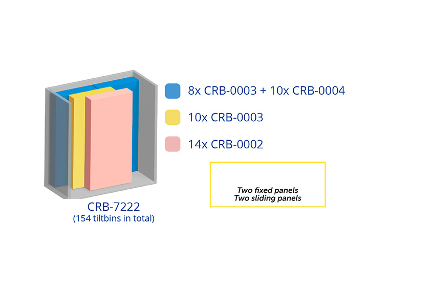- Integrierte Kippbehältermodule pro verschiebbarer Platte: 10x CRB-0003 in der ersten Schiebeplatte + 14x CRB-0002 in der zweiten Schiebeplatte