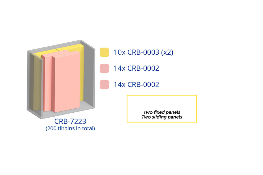 • Integrierte Kippbehältermodule pro verschiebbarer Platte: 14x CRB-0002 (x2)