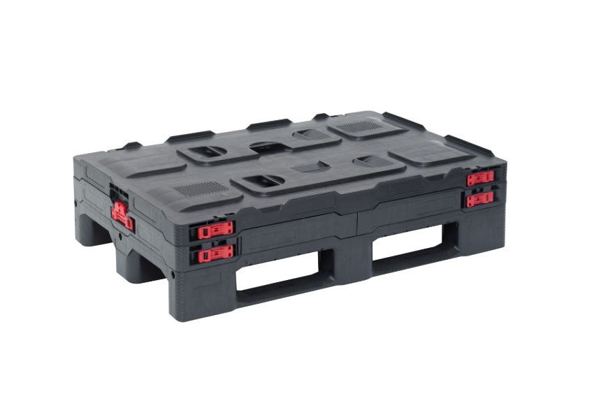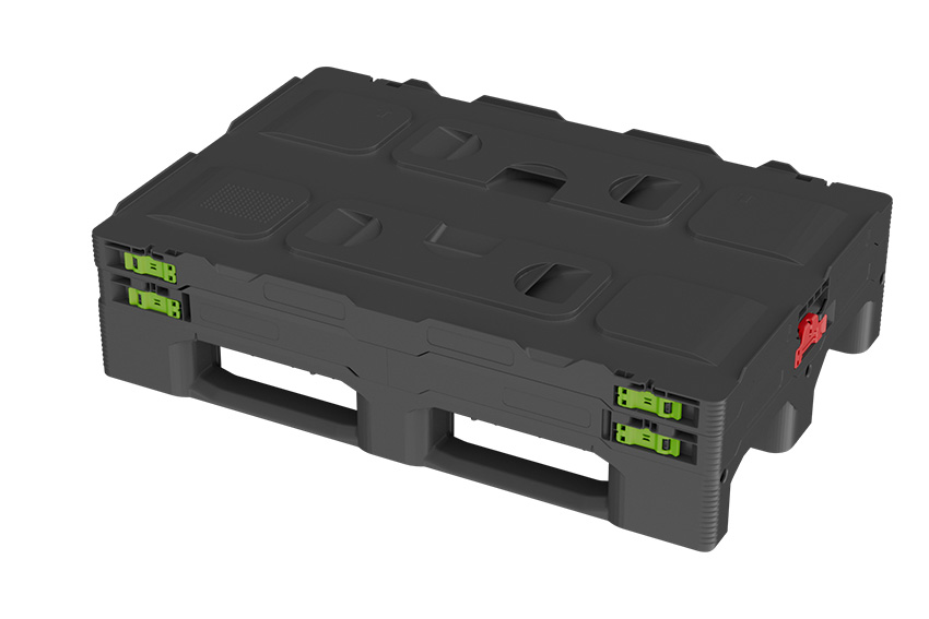 - Foldable multi-trip packaging with 6 hinges according to Euronorm dimensions with lid and pallet (3 skids)