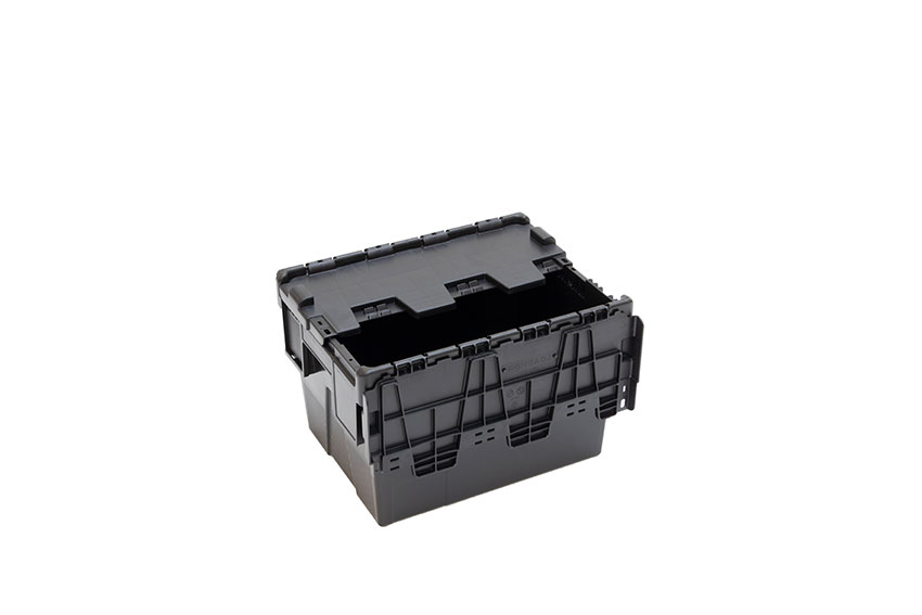 - Conception unique du couvercle : se rabat complètement à plat à côté du bac lors de l'empilage, ce qui réduit les dommages au bac et permet de gagner de la place lors du transport retour