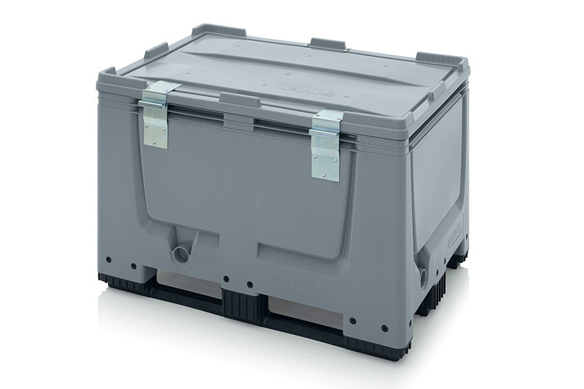 - Caisse-palette sur 3 patins avec couvercle à charnières au format Euronorm