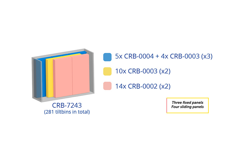 - Modules de bacs basculants intégrés par panneau coulissant : 10x CRB-0003 (x2) + 14x CRB-0002 (x2)